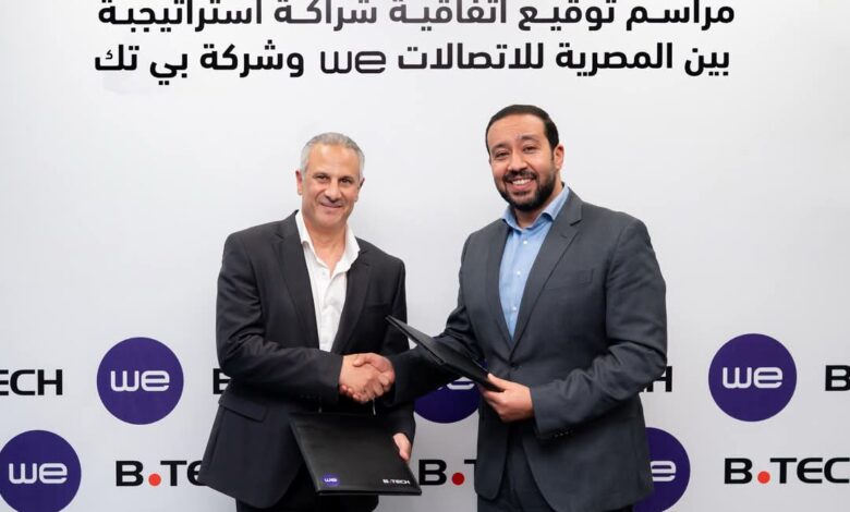 أعلنت شركة WE، أكبر مشغل اتصالات في مصر، عن توقيع شراكة استراتيجية مع شركة “بي تك” للتجارة والتوزيع، الرائدة في مجال بيع الأجهزة الإلكترونية والكهربائية وتقديم خدمات التمويل الاستهلاكي في مصر، بهدف تقديم مجموعة من العروض والخدمات الحصرية لعملاء شركة WE عبر شبكة وفروع بي تك المنتشرة في جميع أنحاء الجمهورية.