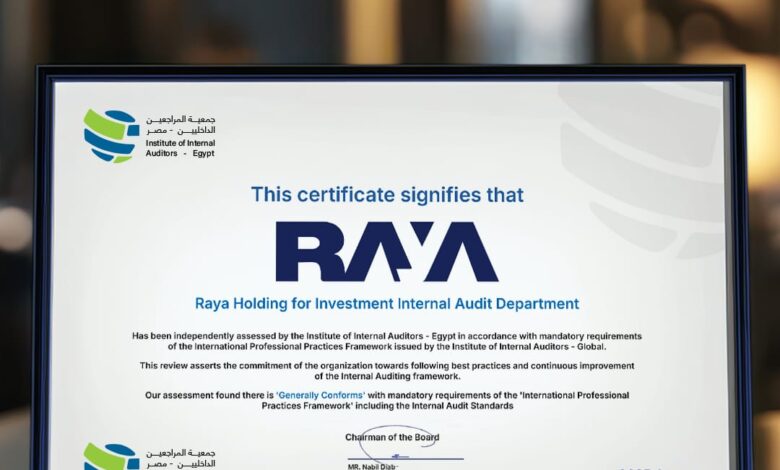 راية القابضة تحصل على شهادة التوافق مع المعايير الدولية للمراجعة الداخلية من الجمعية المصرية للمراجعين الداخليين
